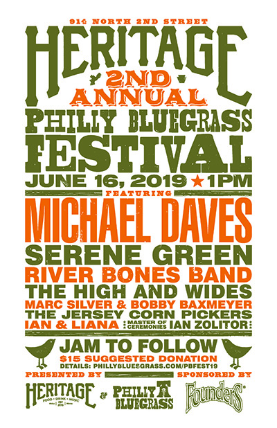 Presented by Heritage and Philly Bluegrass, the festival is sponsored by Founders Brewing Co. Admission is free, with a suggested donation of $15 per person. 100% of proceeds will go to the musicians and Philly Bluegrass, a not-for-profit project of CultureTrust Greater Philadelphia. Donations can be made online now or at the door.