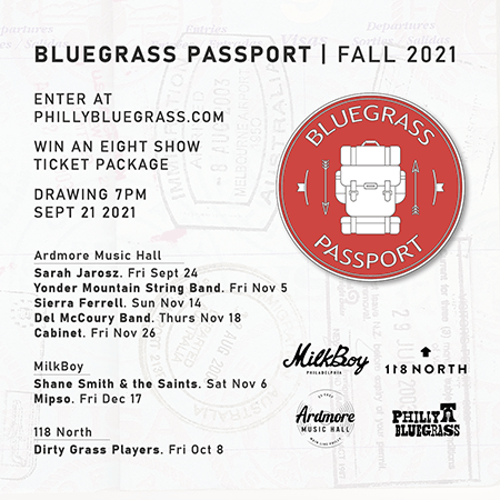 We’re thrilled to announce the return of the Bluegrass Passport Sweepstakes for fall 2021. Now you can enter to win a pair tickets to EIGHT (8) upcoming bluegrass and roots shows taking place in the Philadelphia area this fall. Simply fill out an entry form by Tuesday, September 21 at 7pm ET, when a winner will be drawn at random to receive a pair of tickets to each of the shows below.